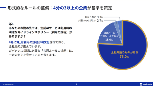 - - 65.4%が人間による最終確認を義務化。「生成AIに任せきりにしない」意思決定プロセスが定着しています。