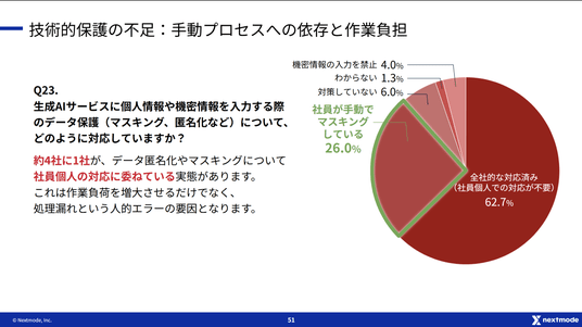 - - 機密データの入力判断を社員個人の認識に委ねている企業が21.3%、データ保護(マスキング・匿名化)を社員の手作業に依存している企業が26.0%、オプトアウト設定が個人任せの企業が24.7%。ルールは存在していても、運用が人の善意に頼っている実態が明らかになりました。