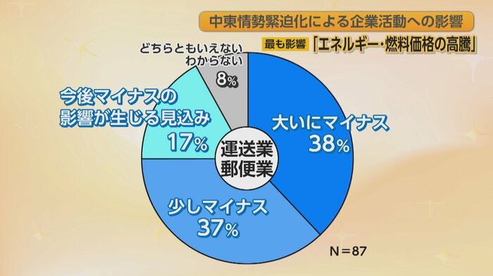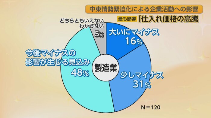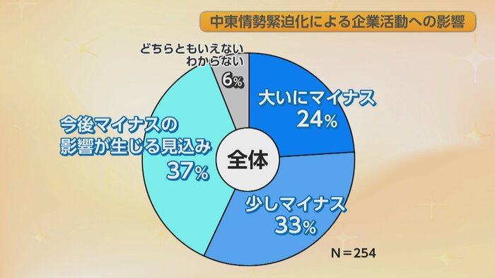 県内254社から回答を得たアンケート結果によりますと、中東情勢の影響で、「大いにマイナス」と答えたのが24%「少しマイナス」と答えたのが33%と過半数を超える57%でマイナスの影響がありました。