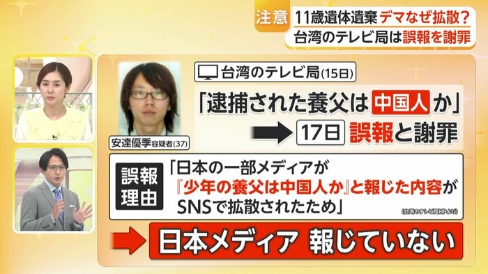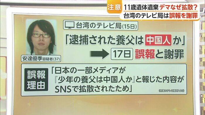 まずはデマの中身を見ていきます。 逮捕された安達容疑者は日本国籍ですが、先週15日に台湾の一部テレビ局が「逮捕された養父は中国人か」と報道しましたが、その2日後、その情報が誤りだったと謝罪しました。