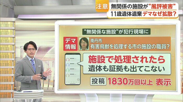 安達容疑者が、南丹市にある「有害鳥獣を処理する市の施設の職員」だったという“デマ情報”も広がりました。施設を名指しして、「施設で処理されたら、遺体も証拠も出てこないだろう」という内容で、この投稿は1830万回以上表示されました。