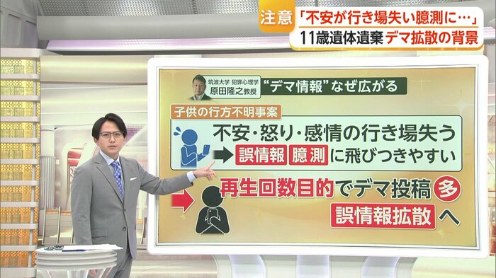 子供の行方不明事案では、心配のあまり不安や怒りがわく一方、その感情が行き場を失うと、誤情報や憶測に飛びつきやすくなる…そういった心理をつき、再生回数目的でデマ情報を投稿する人も多くなるため、どんどん誤った情報が拡散されていくということなんです。