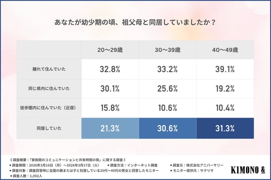 近年、核家族化やライフスタイルの多様化により、家族が一堂に会する機会は減少傾向にあります。実際に20~40代への調査では、年代が下がるにつれて祖父母との同居率は低下しており、社会全体で核家族化が進行してきた背景がうかがえます。
