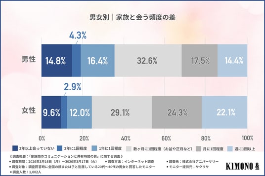 一方で、『1年に1回程度』『2年に1回程度』『2年以上会っていない』と回答した割合は、男性が約4割に対し、女性は約2割となり、男性の方が相対的に会う頻度が低い傾向のようです。