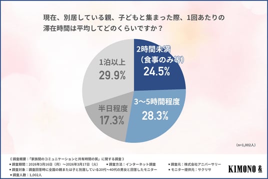 Q3「現在、別居している親、子どもと集まった際、1回あたりの滞在時間は平均してどのくらいですか?」と質問したところ、『2時間未満(食事のみ等)(24.5%)』『3~5時間程度(28.3%)』と半日も家族時間を過ごさない方が半数以上にのぼりました。