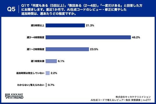 「Q5. Q1で「何度もある(5回以上)」「数回ある(2~4回)」「一度だけある」と回答した方にお聞きします。直近1か月で、AI生成コードのレビュー・修正に費やした追加時間は、週あたりどの程度ですか。」(n=277)と質問したところ、「週5時間以上」が21.3%、「週3~4時間程度」が46.2%という回答となりました。