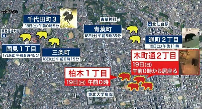 その後、クマは周辺で相次いで目撃された。日付が変わって18日午前0時過ぎには、最初の現場から100メートルほど離れた住宅敷地内に設置された防犯カメラにその姿が。さらに300メートルほどの場所にある東北大学の学生寮付近にも姿を現した。