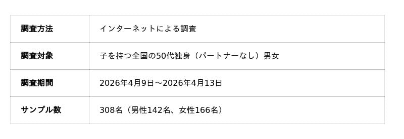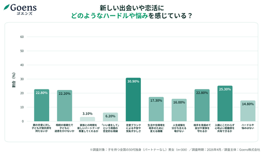 50歳以上限定のマッチングアプリ「Goens(ゴエンズ)」(運営:Goens株式会社/本社:愛知県名古屋市/CEO : 廣澤 和也)は、大人たちの出会いの実態と課題を明らかにするため、子を持つ50代の独身男女308名を対象に意識調査を実施しました。