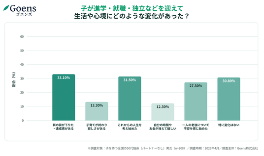 子の進学や独立などを機とした生活や心境の変化を聞くと、「『親』としての肩の荷が下りた・達成感がある(33.1%)」「これからの数十年の人生を、『自分のため』にどう生きるか考えるようになった(31.5%)」という前向きな回答が上位を占めました。
