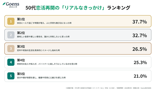 では、変化を感じ、「新しいパートナーが欲しい」と一歩を踏み出した50代は、どのような瞬間にそれを意識したのでしょうか。ここからは、子を持つ50代独身男女が恋活を再開した「リアルなきっかけ」ランキングを紹介します。
