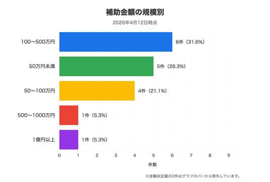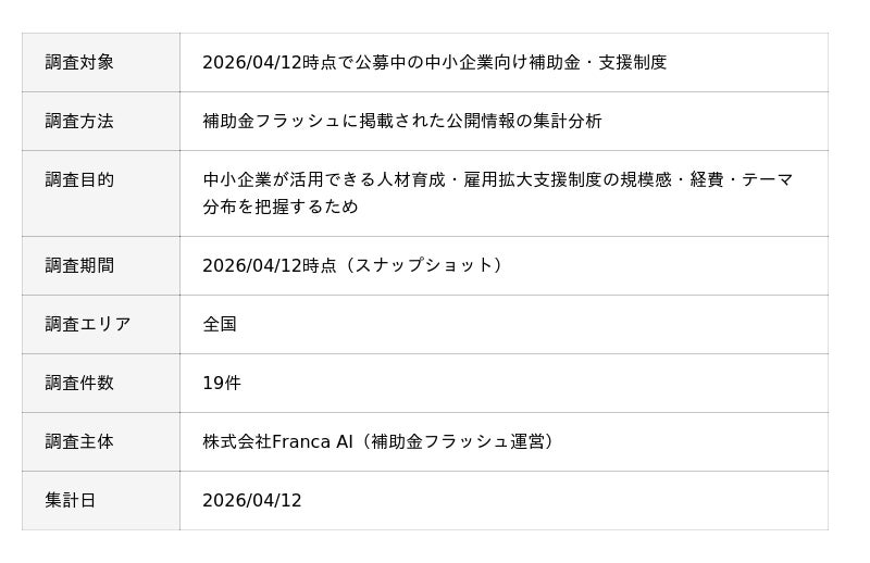 株式会社Franca AI(本社:東京都中央区)が運営する、全国の補助金・助成金を検索できるサービス『補助金フラッシュ』(https://hojokin-kensaku.jp/)は、同サービスに登録された補助金・助成金・支援制度のうち、2026/04/12時点で公募中の中小企業向け補助金・支援制度19件を集計分析しました。