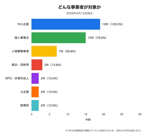 中小企業に加え、個人事業主も申請対象に含む制度が19件中15件で約8割に達しています。法人格や従業員規模によって候補が大幅に絞られる状況ではなく、まず自社の事業規模を確認したうえで対象を特定する流れで探せます。