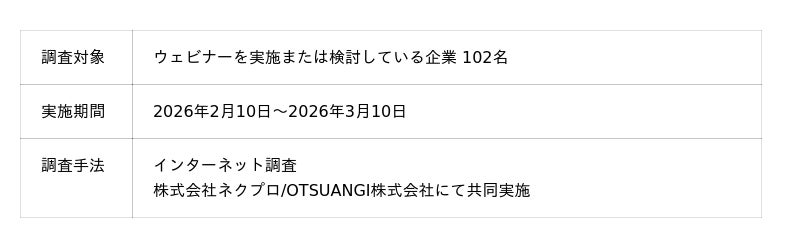 株式会社ネクプロ(本社:東京都千代田区、代表取締役:山田泰生)は、ウェビナーを実施または検討している企業102名を対象に実施した「2026年最新版 ウェビナーに関するアンケート調査結果」を公開いたしました。