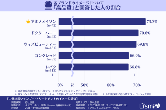 「高品質」というイメージが当てはまると回答した割合は、『アミノメイソン(Amino Mason)』が73.3%、『ドクターハニー(DR.HONEY)』が70.6%、『ウィズビューティー(WITH BEAUTY)』が69.8%、『コンクレッド(CONCRED)』が66.9%、『レバタ(Levata)』が66.8%でした。