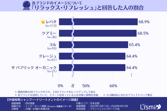 「リラックス・リフレッシュ」というイメージが当てはまると回答した割合は、『レバタ』が68.9%で最も高く、次いで『ケアミー(Care me)』が68.5%、『ヨル』が65.4%、『ザ パブリック オーガニック(THE PUBLIC ORGANIC)』と『クレージュ(CLAYGE)』が同率で64.4%でした。