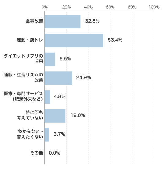 運動・筋トレが半数をこえ、食事改善と睡眠が続いています。複数を選択している人が少ないのも特徴でした。