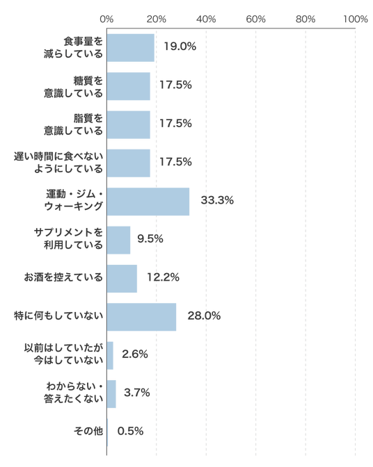 運動派は3人に一人。一方、何もしない人もそれに近い回答に。サプリメントの利用は予想以上で9.5%でした。