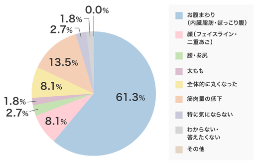 もっとも気になる体型変化の場所は「お腹まわり」が圧倒的に多く6割をこえました。次は「筋肉量の低下」をあげ、男性ならではの回答ともいえそうです。