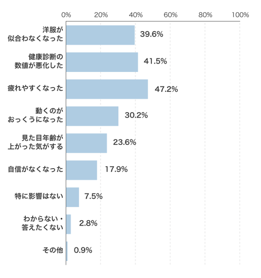 半数近くの方が体型変化で「疲れやすくなった」と感じています。「自信がなくなった」という回答が多いのも気になります。