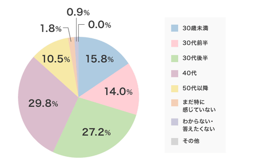 体型変化を実感した年代を聞いてみたところ、30代後半から40代の合計が半数を大きくこえました。
