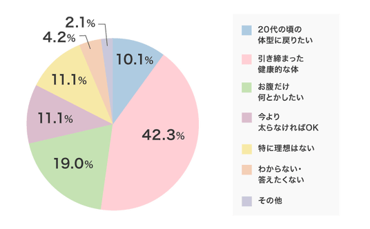 理想の自分の姿に一番近いのは「引き締まった健康的な体」が4割をこえ、次に多かった「お腹だけはなんとかしたい」の2倍以上になりました。