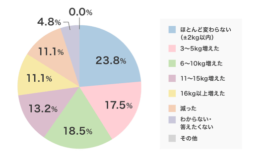 ほとんど変わらない+減ったという回答は3人に一人と少数派。16キロ以上増えた人は11.1%もおいででした。