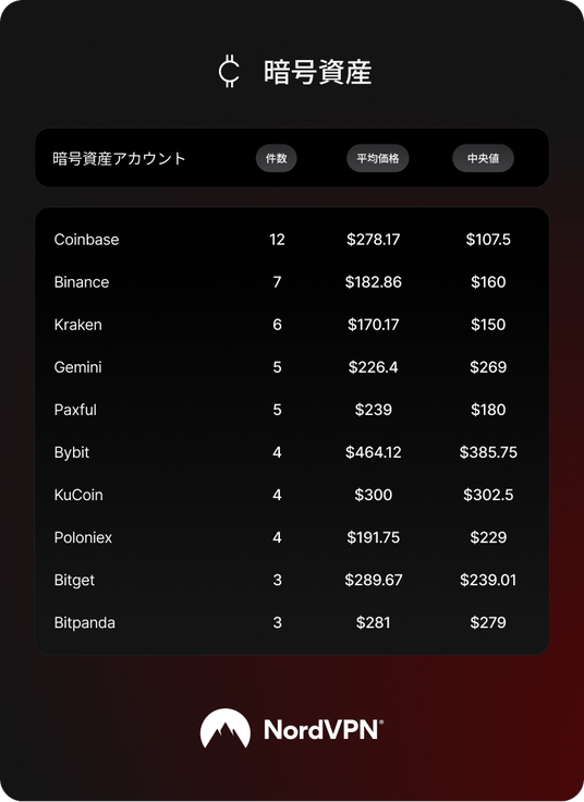 暗号資産取引所のアカウントは、ダークウェブ上で最も高額な商品の一つです。Coinbaseは中央値107.50ドル(約15,900円)、