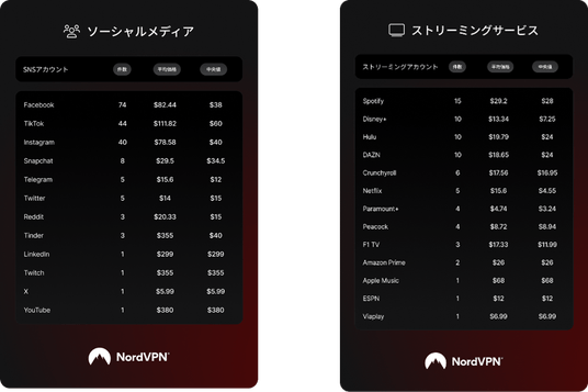 約40ドル(約5,900円)で取引されています。また、動画配信サービスはNetflix約4.55ドル(約670円)と低価格で流通しており、第三者が容易に他人のアカウントへアクセスできる状況が生まれています。ゲームアカウントではSteam約80ドル(約11,800円)、PlayStation Network約150ドル