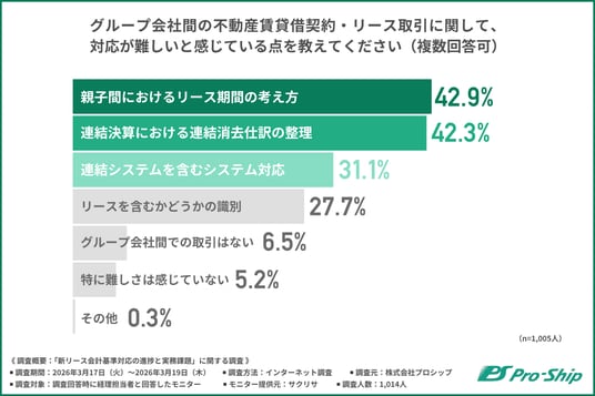 これらの結果から、グループ会社間において、親会社と子会社でリース期間に対する考え方が違うリスクや、連結決算時の相殺処理・システム対応に難しさを感じている経理担当者が多いことがわかります。