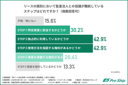 「リースの識別において監査法人との協議が難航しているステップ」について尋ねたところ、複数の論点で調整に時間を要している実態が明らかになりました。