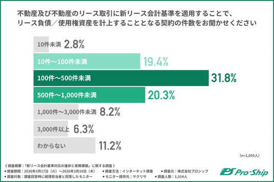 次に、「不動産及び不動産のリース取引に新リース会計基準を適用した場合、リース負債/使用権資産を計上することとなる契約の件数」について尋ねたところ、以下のような結果となりました。
