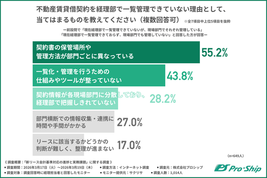 「不動産賃貸借契約を経理部で一覧管理できていない理由」として、『契約書の保管場所や管理方法が部門ごとに異なっている(55.2%)』が最も多く、『一覧化・管理を行うための仕組みやツールが整っていない(43.8%)』『契約情報が各現場部門に分散しており、経理部で把握しきれていない(28.2%)』と続きました。