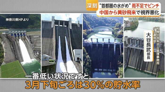 神奈川県は4つのダムがございまして、現在の貯水率は43%。一番低い状況ですと、3月下旬頃は30%の貯水率でございました。