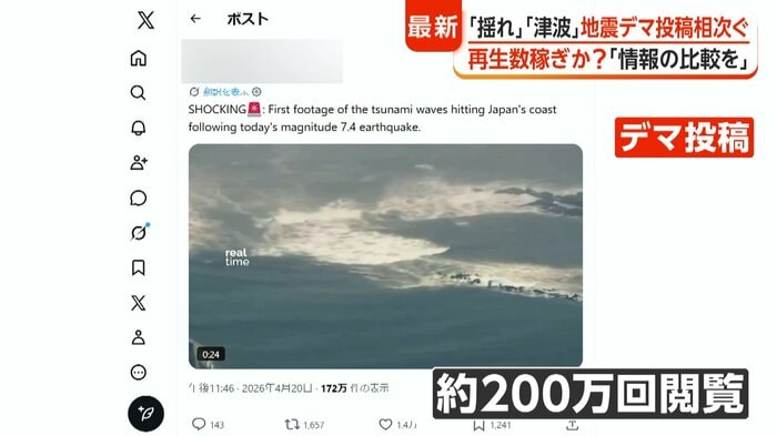 三陸沖を震源として20日に発生したマグニチュード7.7の地震で、SNS上では過去の津波映像などを使ったデマ投稿が拡散している。