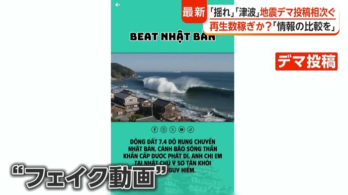 ベトナム語によるデマ投稿のひとつは、今回のものではないとみられる揺れの映像に加え大波が沿岸地域を襲う“フェイク動画”で構成されている。