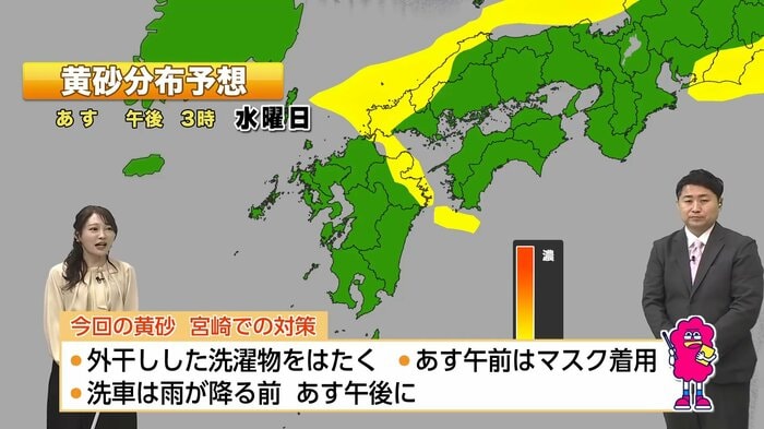 黄砂への対策として古山予報士は、「21日に外干しした洗濯物はしっかりはたくこと」「22日の午前はマスクを着用すること」を推奨。一方で、洗車については「雨が降る前の22日午後に済ませるのがおすすめ」と、具体的なアドバイスを送りました。