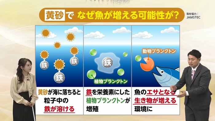 1.鉄分の供給:黄砂の粒子が海に落ちると、その中に含まれる「鉄」が海水に溶け出します。