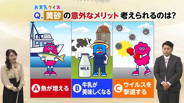 ここで「お天気クイズ」です。黄砂の意外なメリットとして考えられるのは次のうちどれでしょう?