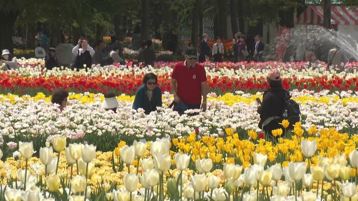 光熱費やチューリップ球根の高騰から入場料は去年より500円高い2000円となりましたが、会場には多くの国内外の観光客が訪れ、色鮮やかな花をバックに写真を撮るなど楽しんでいます。
