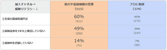 加入チャネルの差が、保険リテラシーの差にも影響-150名の深掘り調査で明らかに。知人家族の紹介・金融機関の営業で保険に加入している人は、プロに相談して加入している人より、自分の保険を理解できていない。