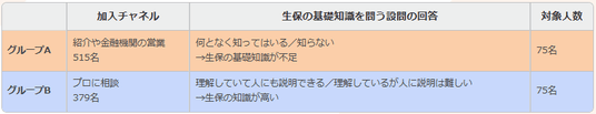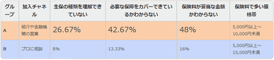 その結果、グループA(紹介や金融機関の営業/生保知識が不足)は、グループB(プロに相談/生保知識が高い)と比較して、自分の保険に対する理解度が低いことがわかりました。