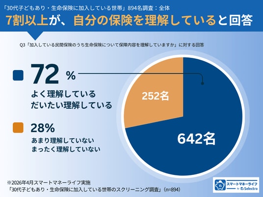 30代子育て世帯894名に対し、加入している生命保険の内容を理解しているかどうか尋ねたところ、642名(72%)が「よく理解している」「だいたい理解している」、252名(28%)が「あまり理解していない」「全く理解していない」と回答しました。
