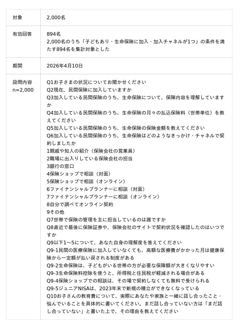 回収した2,000名のうち「子どもあり・生命保険に加入・加入チャネルが1つ」の条件を満たす894名を有効回答とみなし集計対象とした。