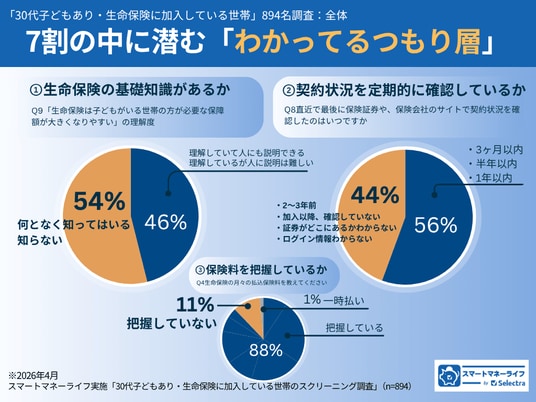 「自分の保険を理解している」と回答した7割の中には、生命保険の基礎知識や加入している保険証券の確認頻度といった面で、保険リテラシーが不足している「わかってるつもり層」が含まれていることが明らかになった。