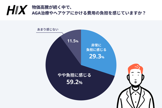 AGA治療やヘアケアにかける費用の負担感について聞いたところ、「非常に負担に感じる」(29.3%)と「やや負担に感じる」(59.2%)を合わせ、約9割(88.5%)が費用負担を感じていることが明らかになりました。物価高の影響が、薄毛ケアにまで及んでいる実態がうかがえます。