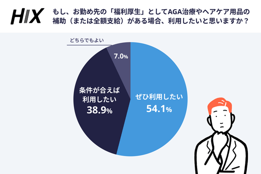 勤務先の福利厚生としてAGA治療やヘアケア用品の補助がある場合の利用意向を聞いたところ、「ぜひ利用したい」(54.1%)と「条件が合えば利用したい」(38.9%)を合わせ、93.0%が利用意向を示しました。潜在的なニーズの高さが浮き彫りとなっています。