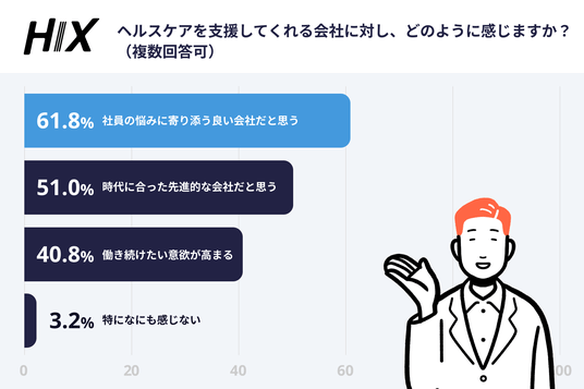 ヘルスケアを支援してくれる会社に対する印象を聞いたところ(複数回答)、「社員の悩みに寄り添う良い会社だと思う」が最多の61.8%、次いで「時代に合った先進的な会社だと思う」が51.0%、「働き続けたい意欲(エンゲージメント)が高まる」が40.8%となりました。ヘルスケア支援が企業イメージの向上や社員の定着・エンゲージメント向上にもつながることが示唆されています。
