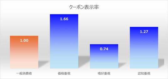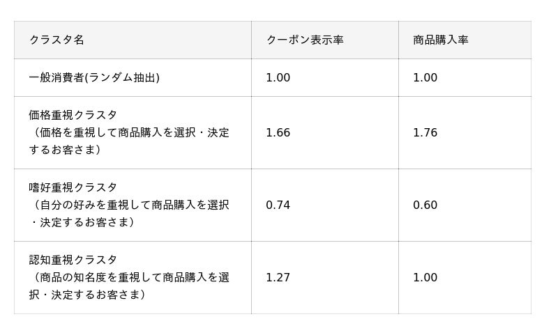 本実証の結果、価格を重視する「価格重視」クラスタでは、一般のお客さまと比較してクーポン表示率が1.66倍、購入率が1.76倍とクーポンへの反応が最も高いという結果が見られました。また、自分の好みを重視する「嗜好重視」クラスタは一般のお客さまと比較して、クーポン表示率が0.74倍、購入率が0.6倍と「反応期待率」から予測した見解の通り、クーポンへの反応が低いという結果となりました。