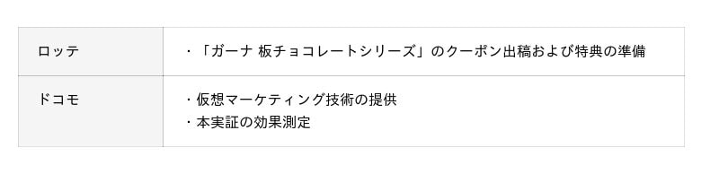 ロッテとドコモはそれぞれ、本実証で得られた知見を活かし、仮想マーケティング技術を活用したマーケティング支援サービスの開発・提供や、より効果的なマーケティングの実施をめざします。