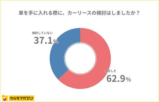 カーリースを知っている781人に対し、車を手に入れる際にカーリースの検討をしたかを聞いたところ、「検討した」が491人(62.9%)という結果になりました。認知者の6割以上が検討しており、車の持ち方の選択肢として具体的に比較検討されていることがわかります。